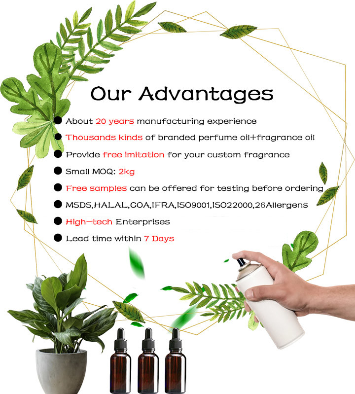 Ароматы широко используются в парфюмерии, креме, средствах по уходу за кожей, шампуни, мытье тела, мыло, моющее средство, моющее средство для рук, моющее средство для посуды, смягчающее средство, моющее средство для стирки, освежитель воздуха,инсектицид, аэрозоли, твердые освежители, туалетная вода, москитоудерживающие фимиам, палочки, фимиам, свечи, полотенце и так далее.